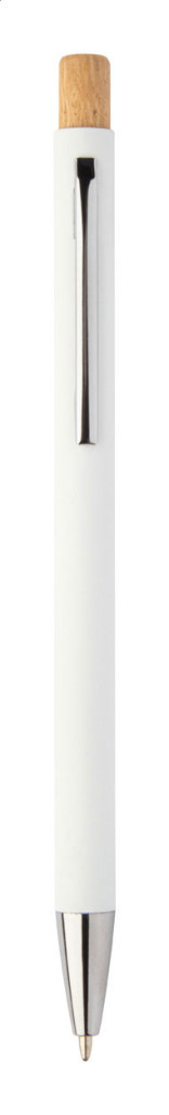 Újrahasznosított alumínium golyóstoll gumírozott felülettel, bambusz gombbal és króm részekkel. Speciális bevonattal rendelkezik, amely különlegesen fényessé teszi a gravírozott emblémát. Kék tollbetéttel szállítjuk.