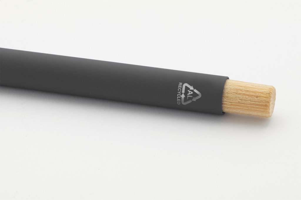 Újrahasznosított alumínium golyóstoll gumírozott felülettel, bambusz gombbal és króm részekkel. Speciális bevonattal rendelkezik, amely különlegesen fényessé teszi a gravírozott emblémát. Kék tollbetéttel szállítjuk.
