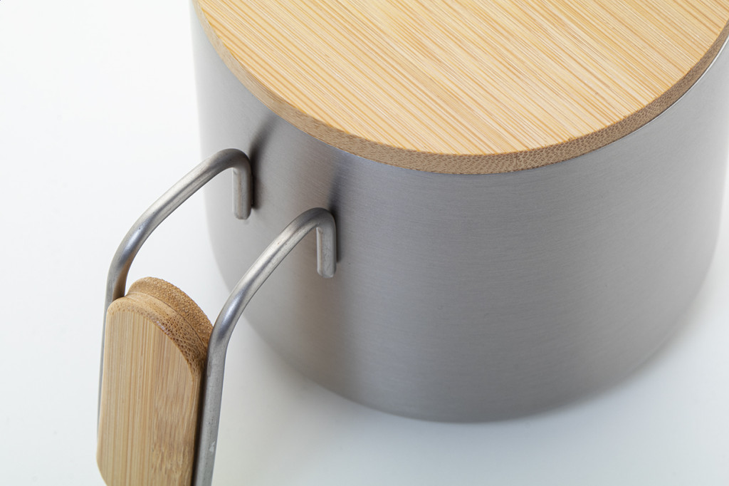 Duplafalú, újrahasznosított rozsdamentes acél thermo bögre bambusz fedéllel és foganytyúval. 300 ml.