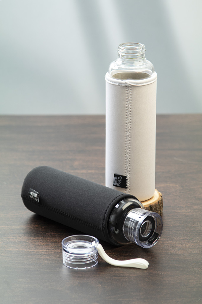 Újrahasznosított üveg kulacs PS műanyag kupakkal, szilikon hordszíjjal és RPET neoprén borítással, 550 ml. Nem alkalmas szénsavas italok tárolására.