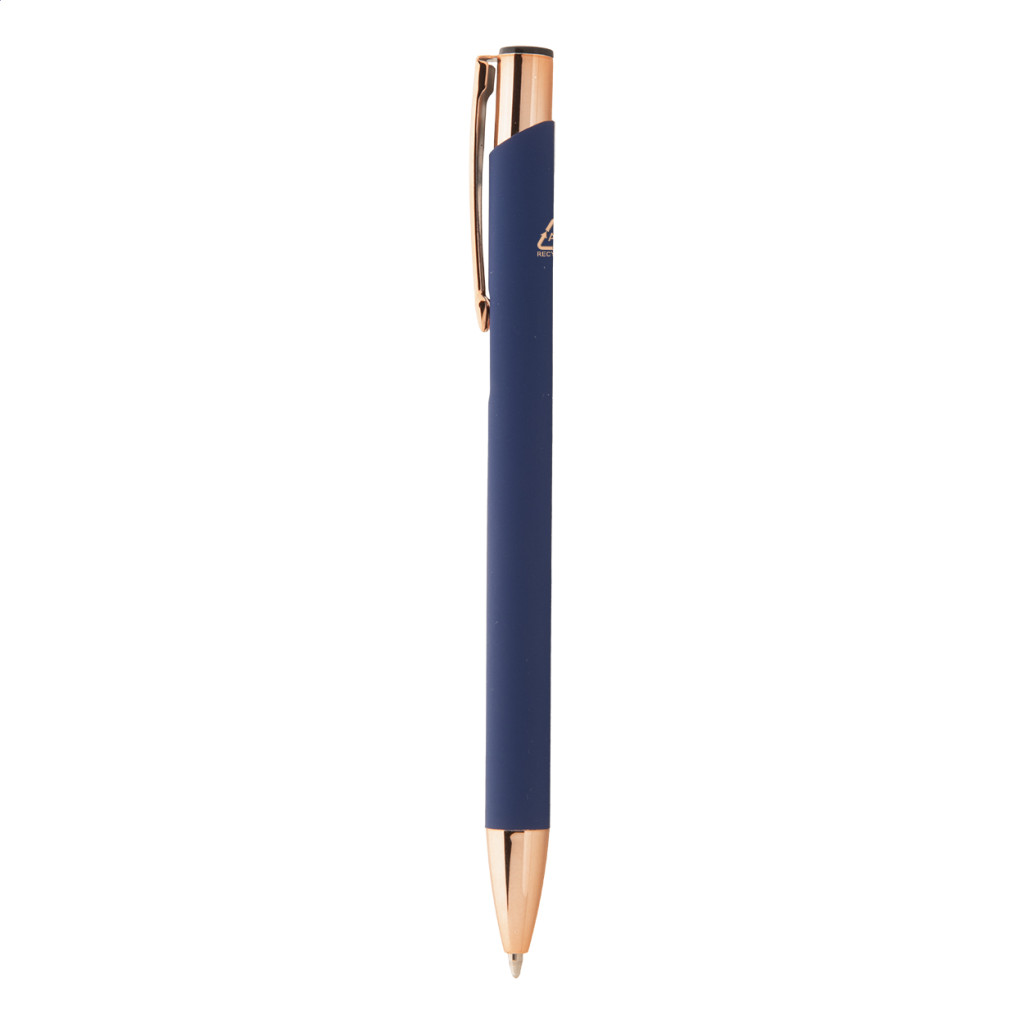 Újrahasznosított alumínium golyóstoll gumírozott felülettel és rózsaarany részekkel. Speciális bevonattal rendelkezik, amely különlegesen fényessé teszi a gravírozott emblémát. Kék tollbetéttel szállítjuk.