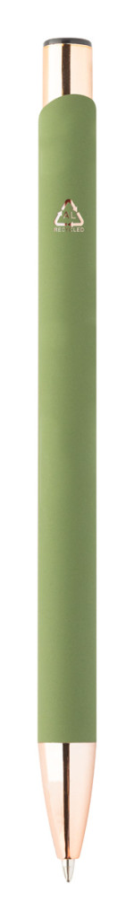 Újrahasznosított alumínium golyóstoll gumírozott felülettel és rózsaarany részekkel. Speciális bevonattal rendelkezik, amely különlegesen fényessé teszi a gravírozott emblémát. Kék tollbetéttel szállítjuk.