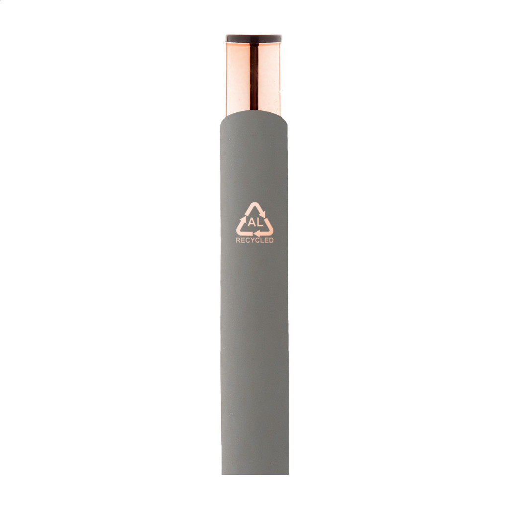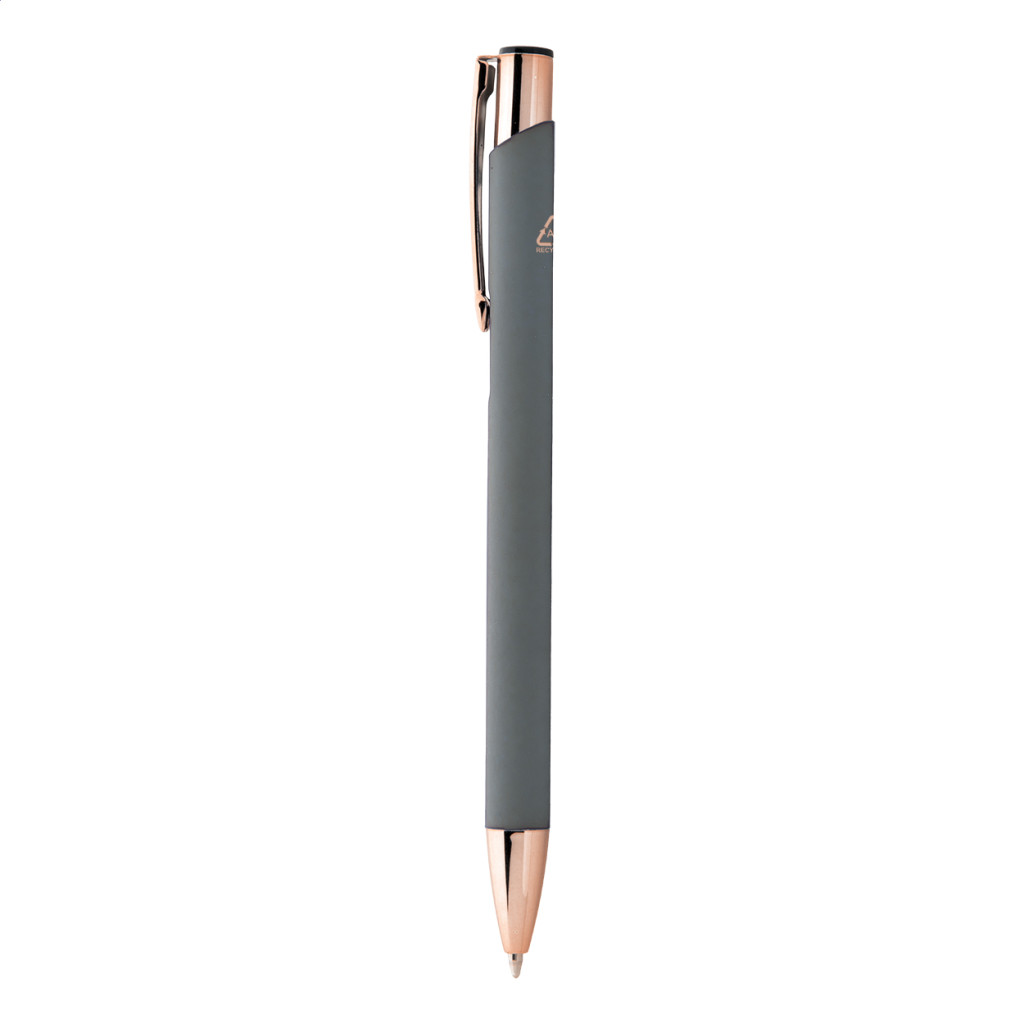 Újrahasznosított alumínium golyóstoll gumírozott felülettel és rózsaarany részekkel. Speciális bevonattal rendelkezik, amely különlegesen fényessé teszi a gravírozott emblémát. Kék tollbetéttel szállítjuk.