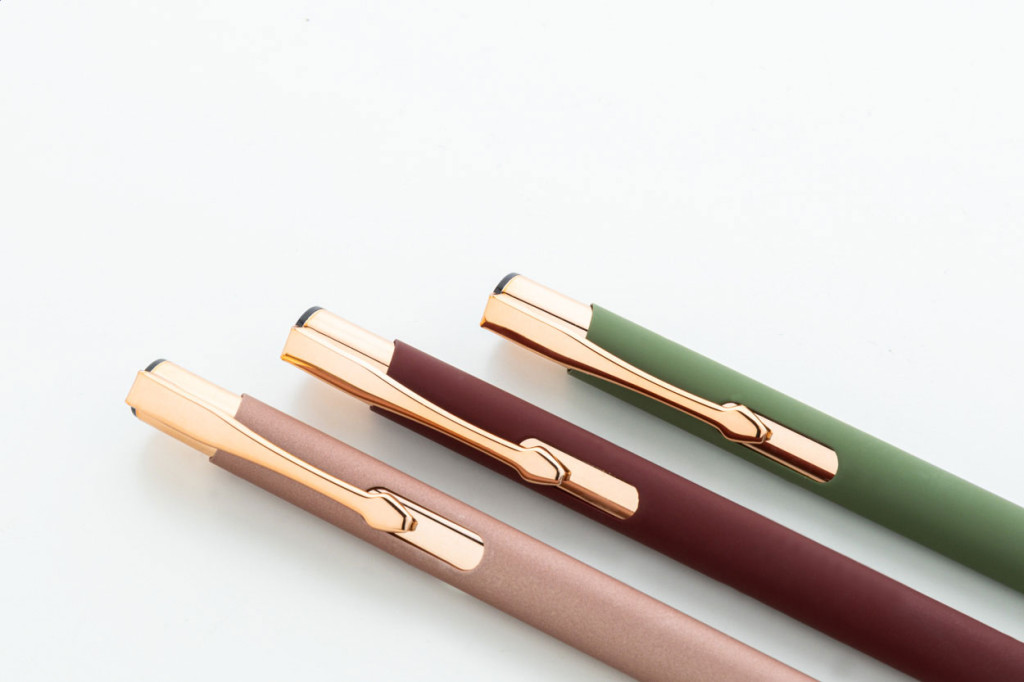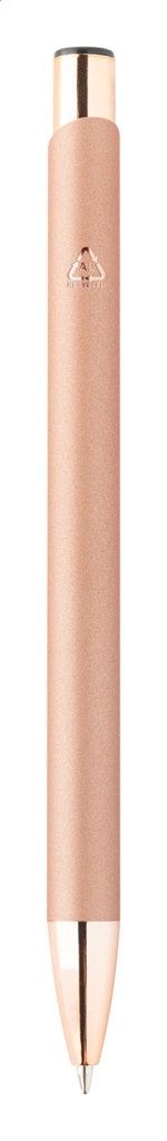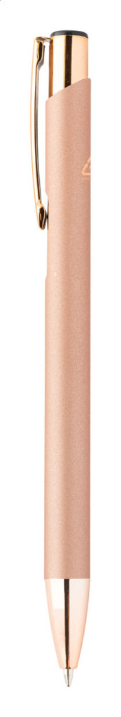 Újrahasznosított alumínium golyóstoll gumírozott felülettel és rózsaarany részekkel. Speciális bevonattal rendelkezik, amely különlegesen fényessé teszi a gravírozott emblémát. Kék tollbetéttel szállítjuk.