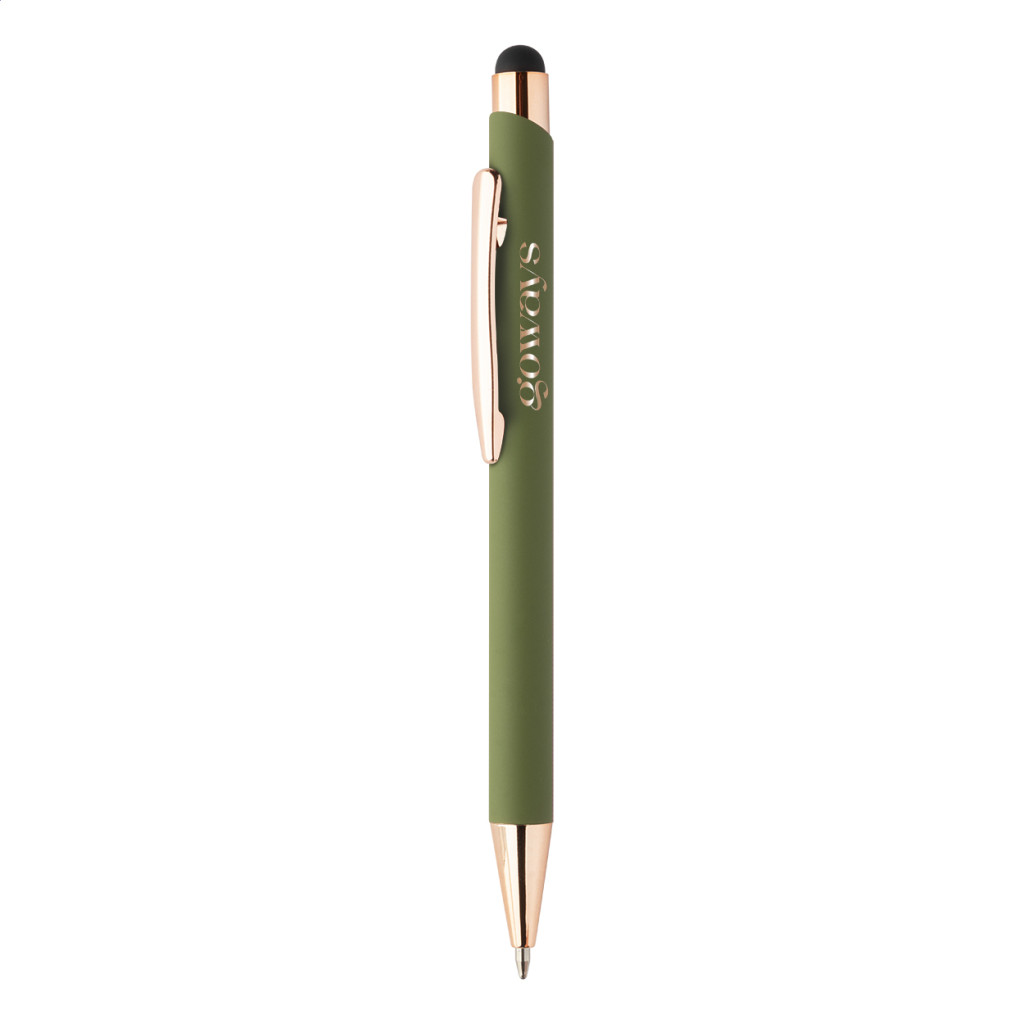 Újrahasznosított alumínium és érintőképernyős golyóstoll gumírozott felülettel és rózsaarany részekkel. Speciális bevonattal rendelkezik a rózsaarany színű tükörgravírozáshoz. Kék tollbetéttel.