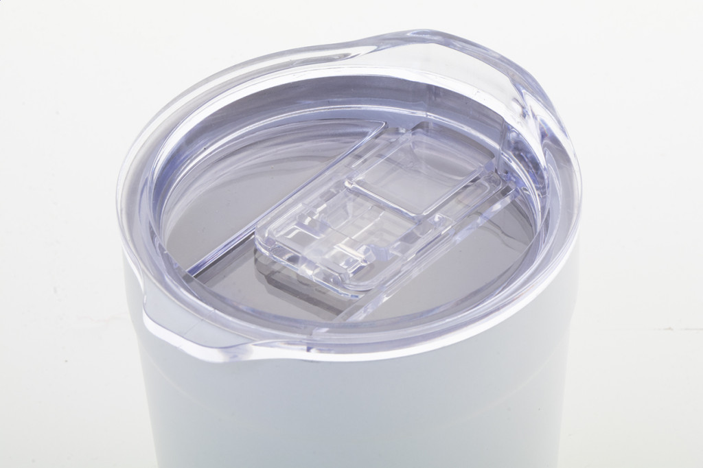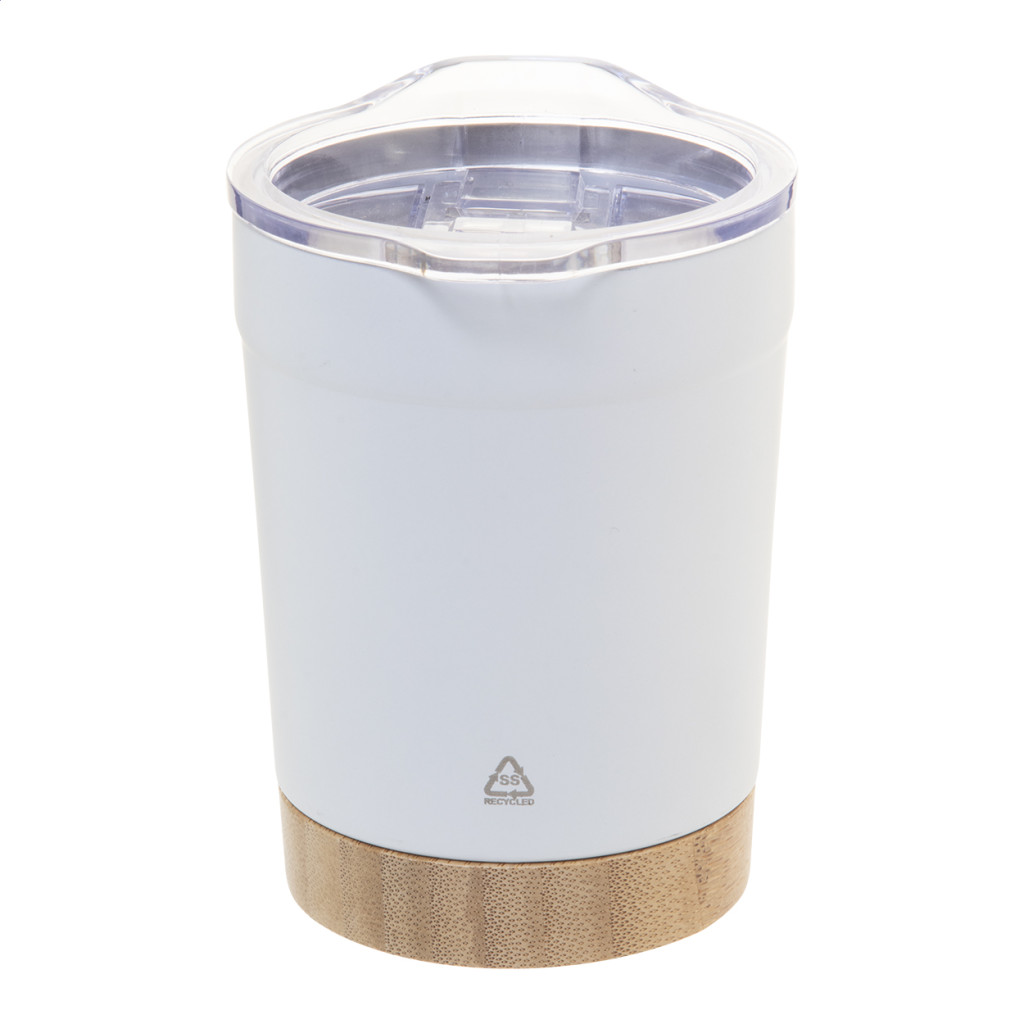 Duplafalú, újrahasznosított rozsdamentes acél vákuumszigetelt thermo pohár bambusz alappal és ABS műanyag ivófedéllel. 300 ml.