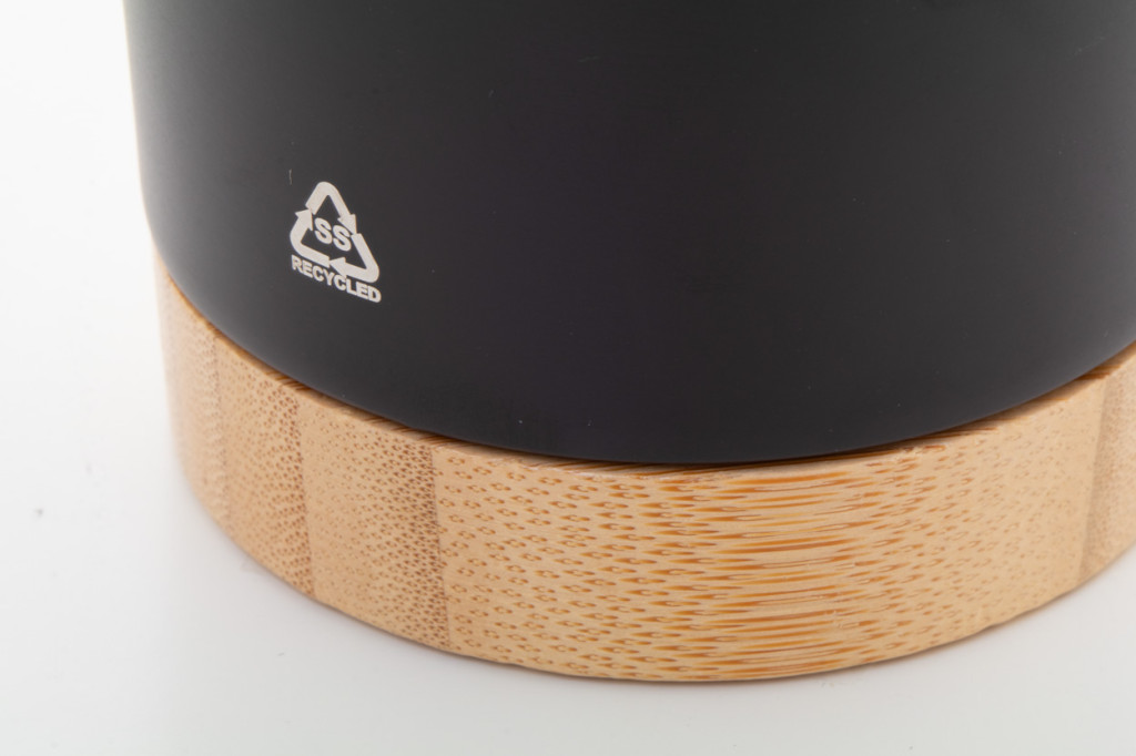 Duplafalú, újrahasznosított rozsdamentes acél vákuumszigetelt thermo pohár bambusz alappal és ABS műanyag ivófedéllel. 300 ml.