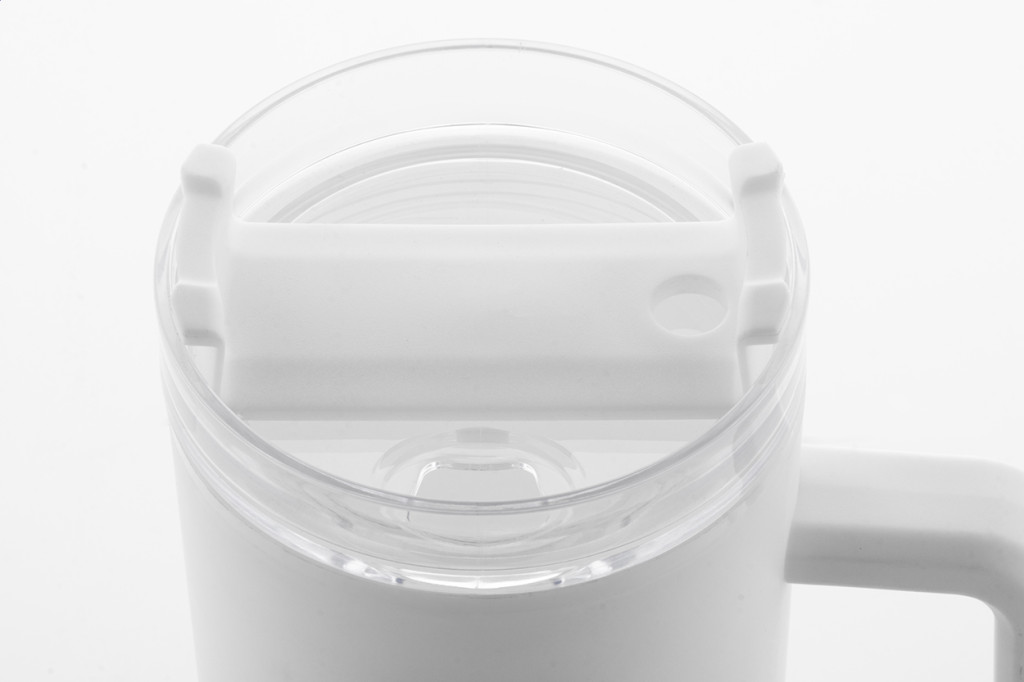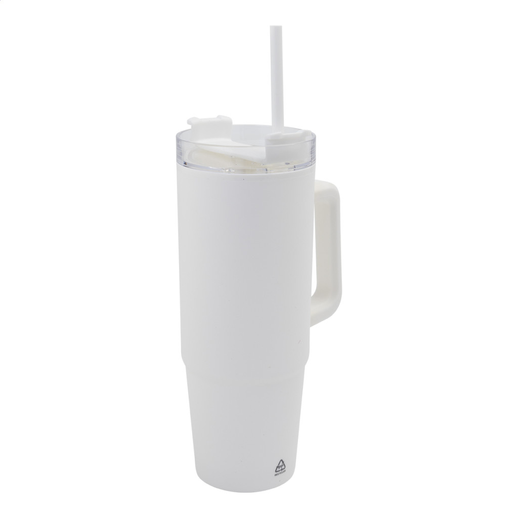 Duplafalú, újrahasznosított PP műanyag szigetelt thermo bögre műanyag ivófedéllel és szívószállal, 900 ml.