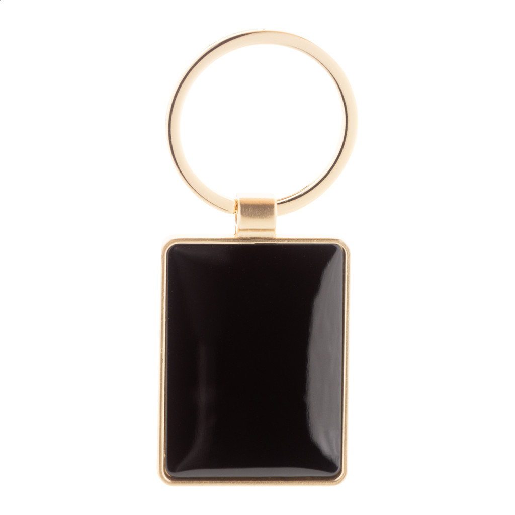 Téglalap alakú fém kulcstartó arany kivitelben, fegyverfém lemezzel. Kraft papír dobozban.