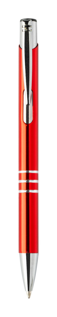 Újrahasznosított alumínium golyóstoll, fémes felülettel és kék tollbetéttel.