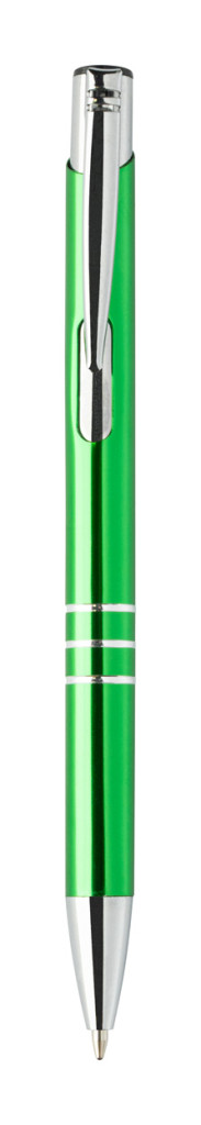 Újrahasznosított alumínium golyóstoll, fémes felülettel és kék tollbetéttel.
