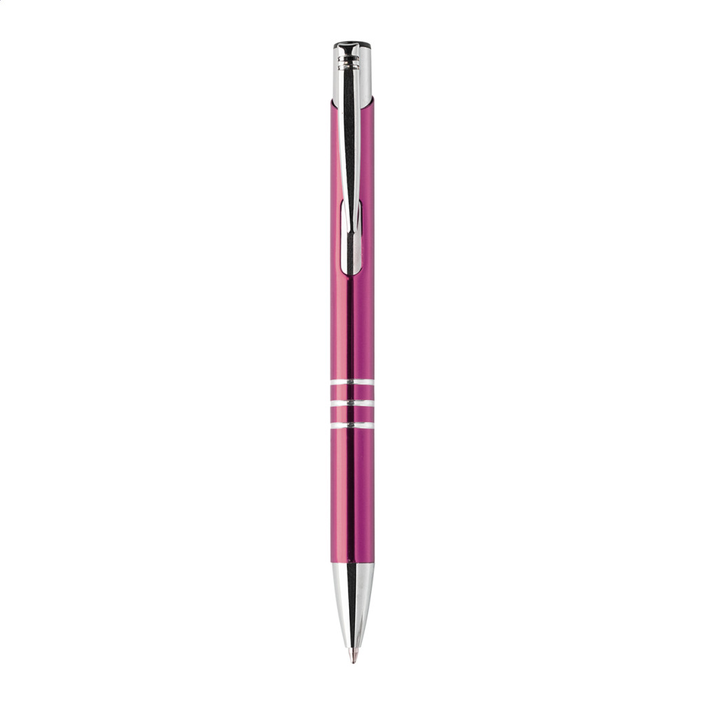 Újrahasznosított alumínium golyóstoll, fémes felülettel és kék tollbetéttel.