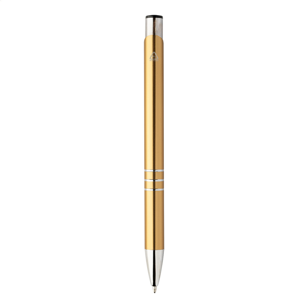 Újrahasznosított alumínium golyóstoll, fémes felülettel és kék tollbetéttel.