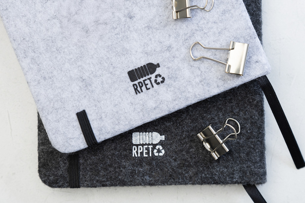 RPET filc borítású jegyzetfüzet 80 vonalas lappal, újrahasznosított papírból. Könyvjelzővel, gumipánttal és tolltartóval. A5 méretű.