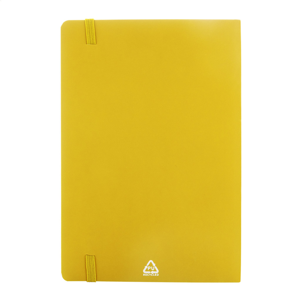 Újrahasznosított PU bőr, puha fedelű jegyzetfüzet 80 vonalas lappal, újrahasznosított papírból. Hozzáillő színű könyvjelzővel és gumiszalaggal. A5 méretű.