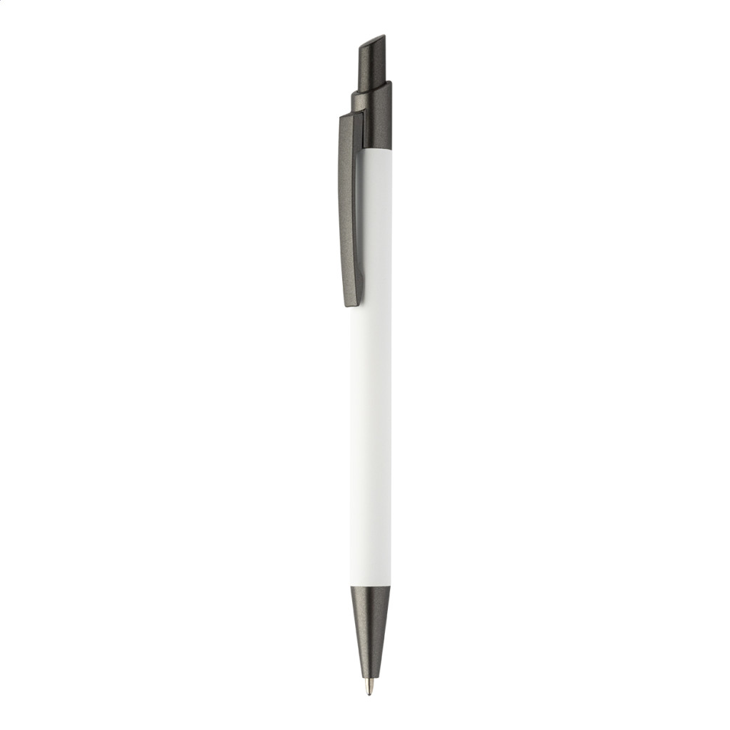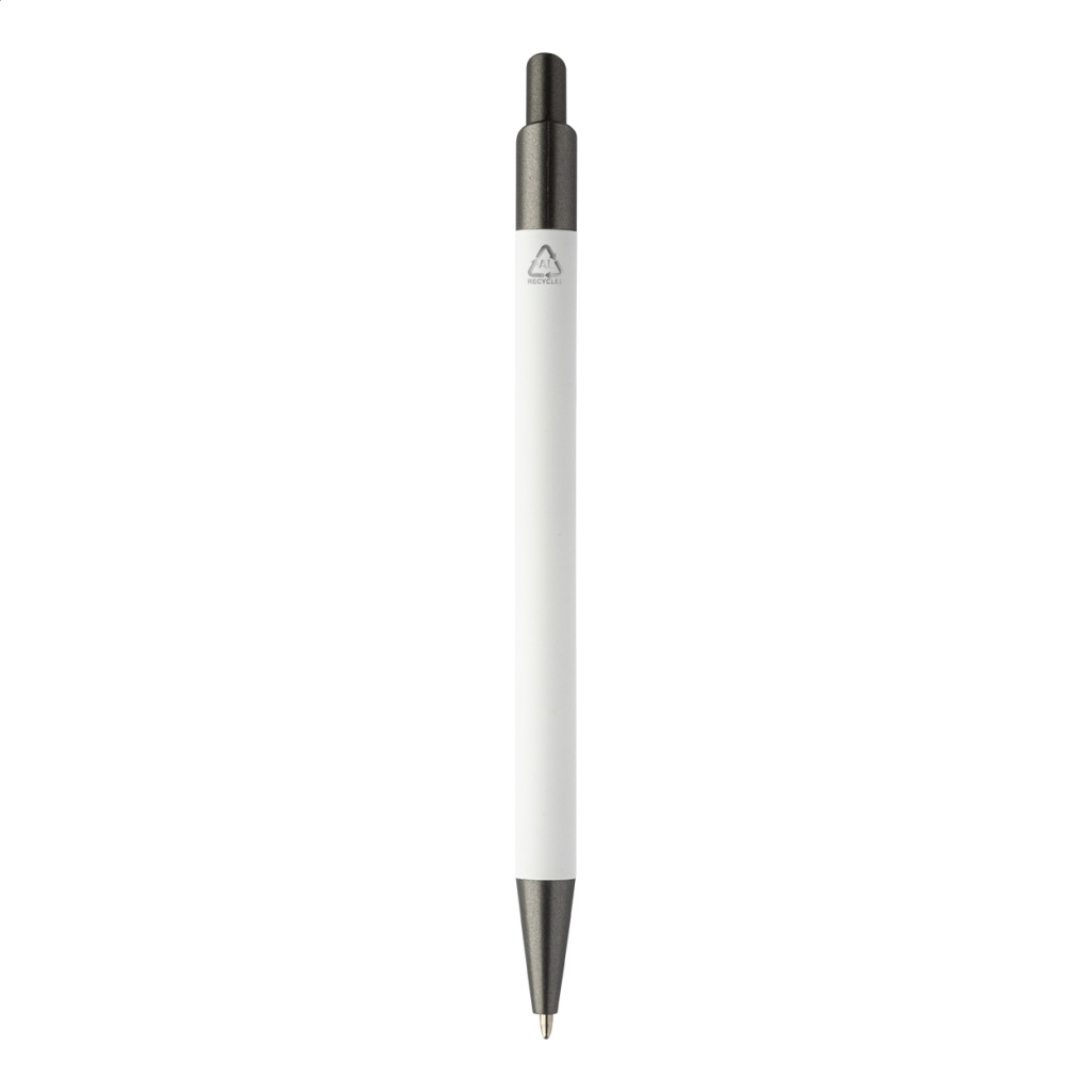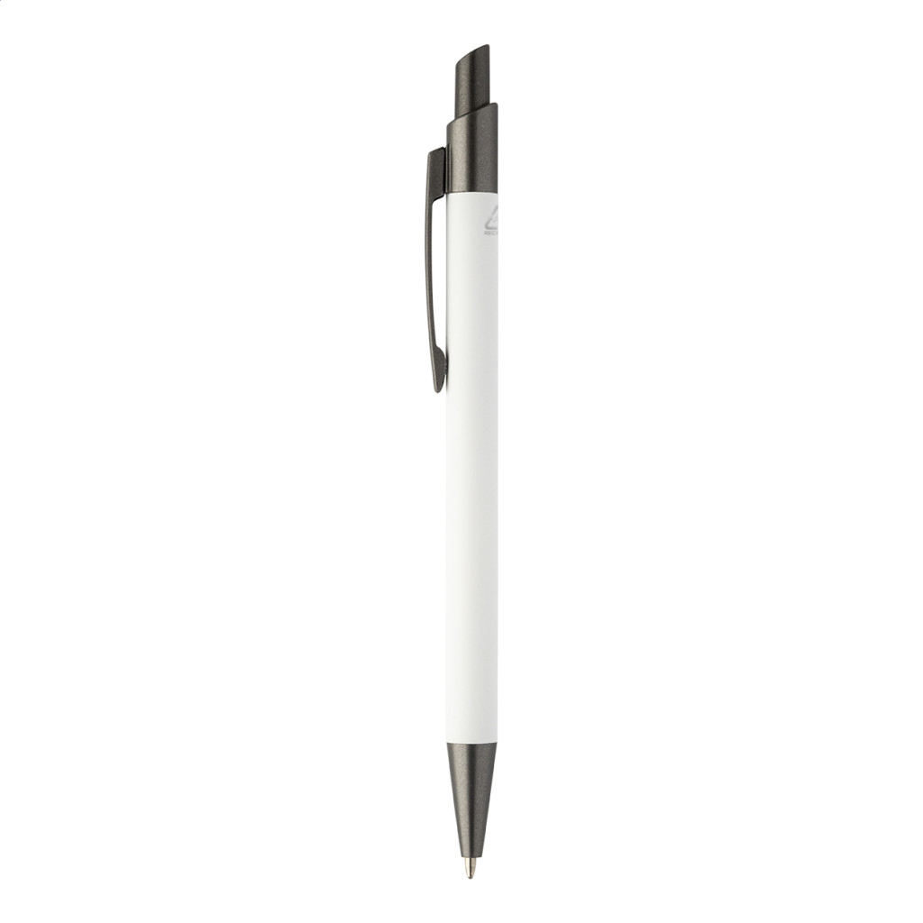 Újrahasznosított alumínium golyóstoll gumírozott testtel, fegyverfém részekkel. Kék tolbetéttel.