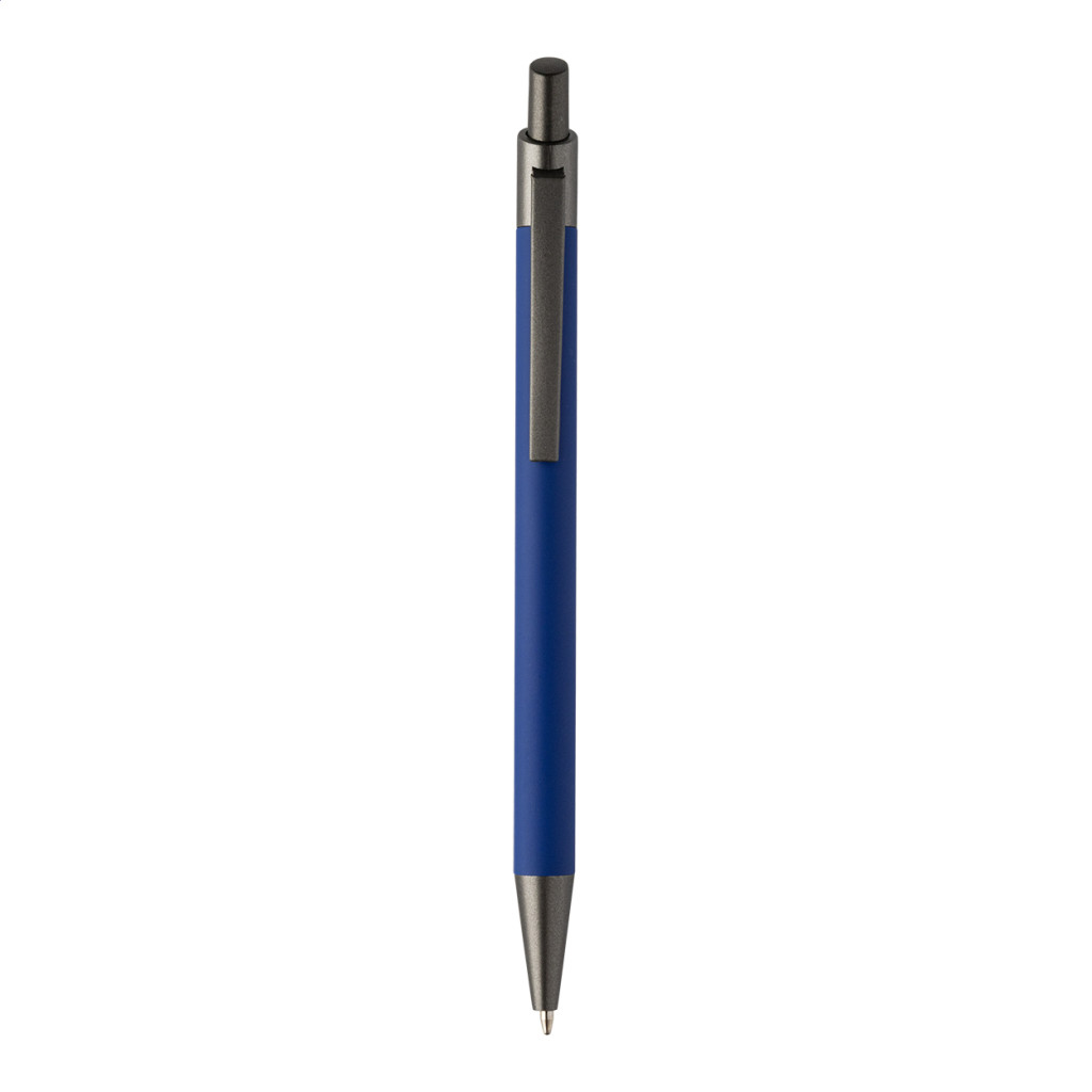 Újrahasznosított alumínium golyóstoll gumírozott testtel, fegyverfém részekkel. Kék tolbetéttel.