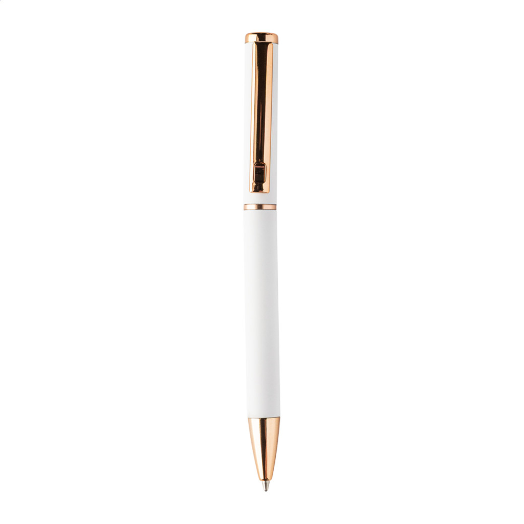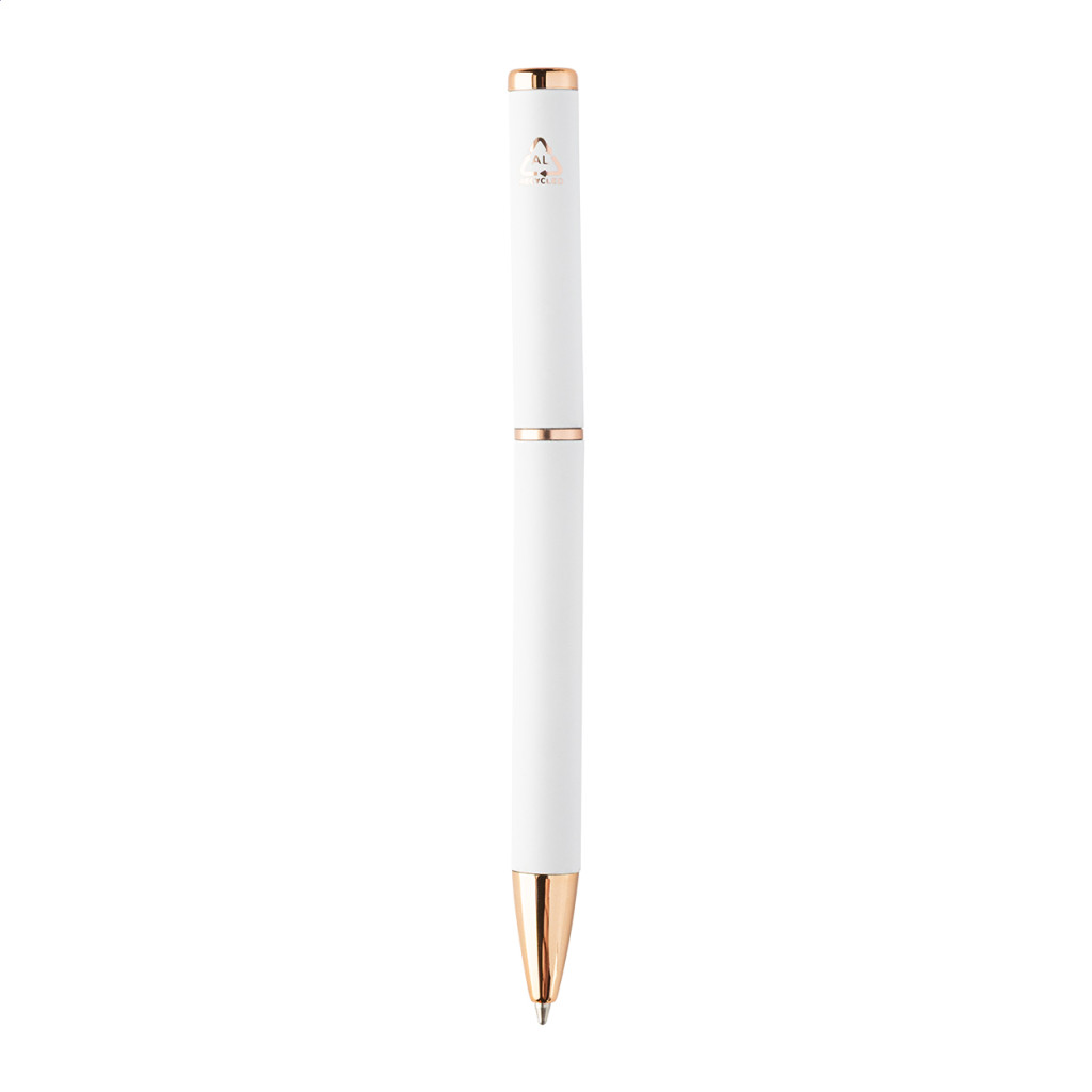 Újrahasznosított alumínium tollszett golyóstollal és rollertollal, gumírozott felülettel és rózsaarany részletekkel. Kék tollbetéttel. Speciális bevonattal a tükörlézeres gravírozáshoz rózsaarany színben. Fekete papír ajándékdobozban.