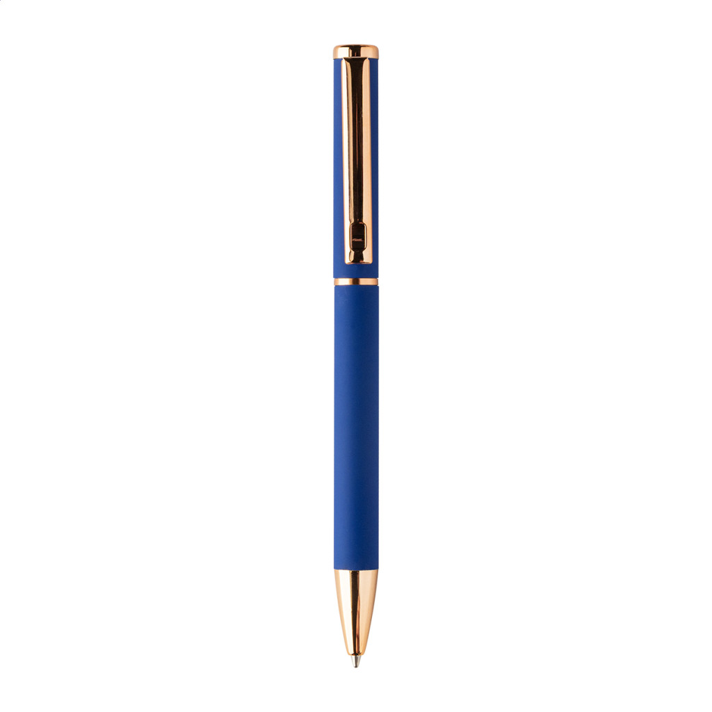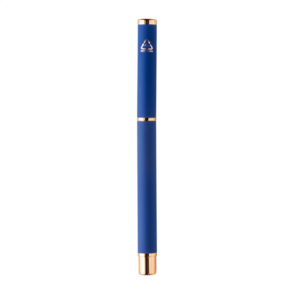 Újrahasznosított alumínium tollszett golyóstollal és rollertollal, gumírozott felülettel és rózsaarany részletekkel. Kék tollbetéttel. Speciális bevonattal a tükörlézeres gravírozáshoz rózsaarany színben. Fekete papír ajándékdobozban.