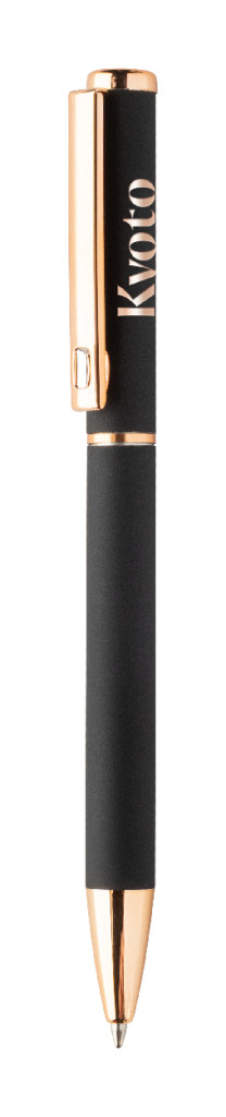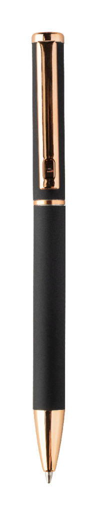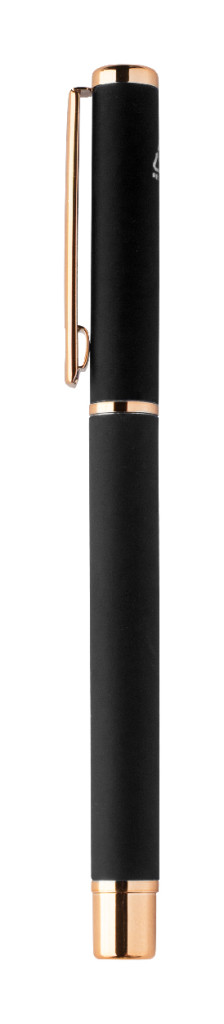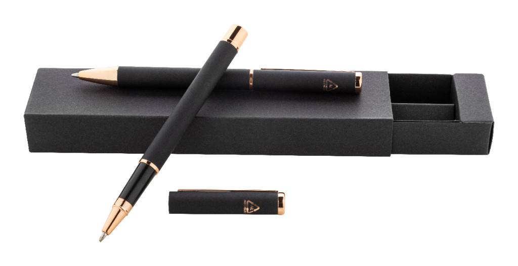 Újrahasznosított alumínium tollszett golyóstollal és rollertollal, gumírozott felülettel és rózsaarany részletekkel. Kék tollbetéttel. Speciális bevonattal a tükörlézeres gravírozáshoz rózsaarany színben. Fekete papír ajándékdobozban.