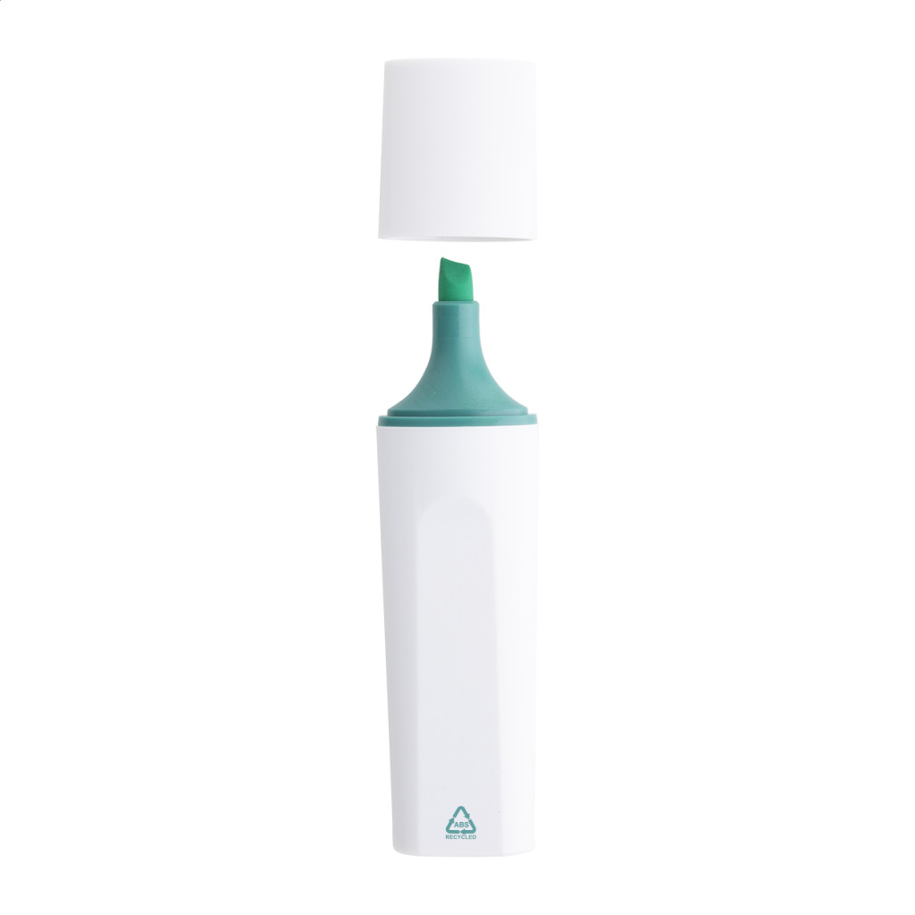 Újrahasznosított ABS műanyag szövegkiemelő kupakkal.