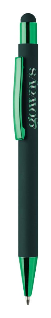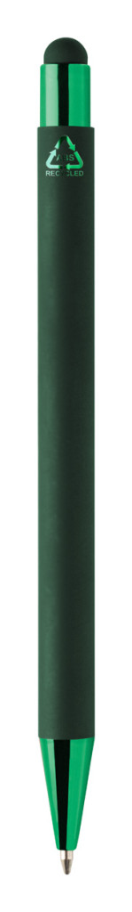 Újrahasznosított alumínium és érintőképernyős golyóstoll gumírozott testtel és színes fényes fémes részekkel. Speciális bevonattal a fémes részekhez illeszkedő tükörgravírozáshoz. Kék tollbetéttel.