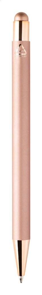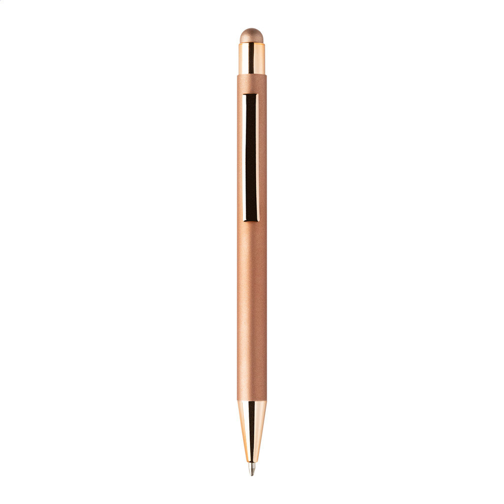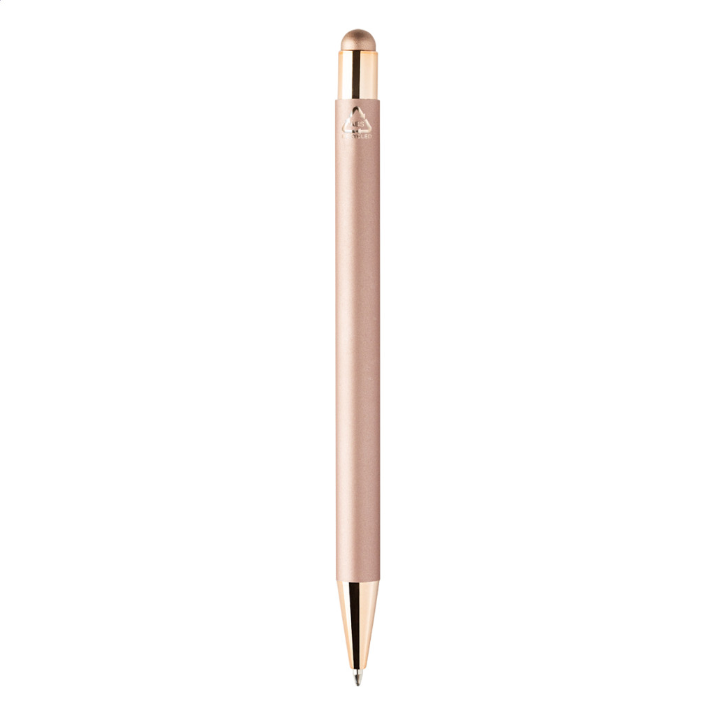 Újrahasznosított alumínium és érintőképernyős golyóstoll gumírozott testtel és színes fényes fémes részekkel. Speciális bevonattal a fémes részekhez illeszkedő tükörgravírozáshoz. Kék tollbetéttel.