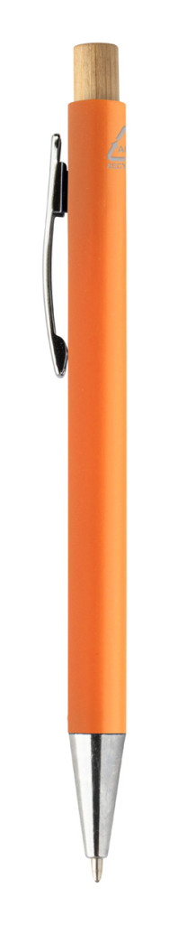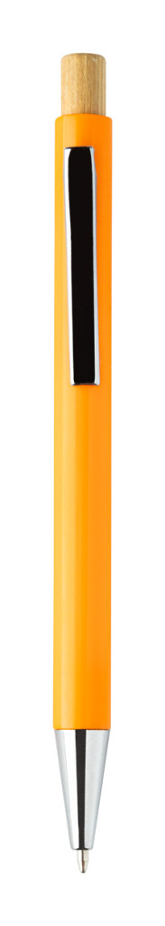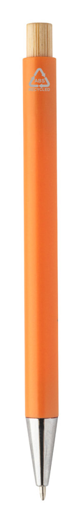 Újrahasznosított ABS műanyag golyóstoll bambusz gombbal és fém klipsszel. Kék tollbetéttel.