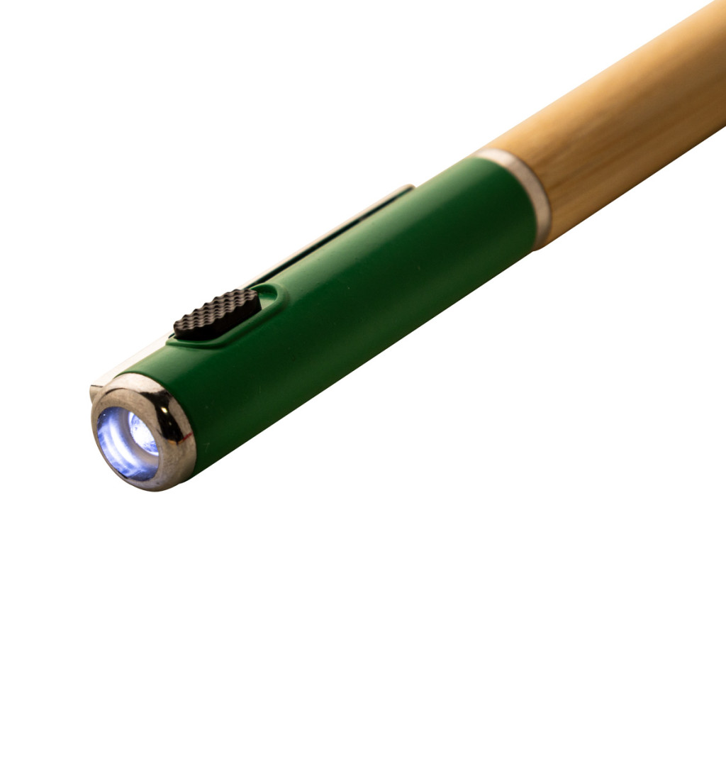 Bambuszból és újrahasznosított ABS műnyagból készült, tekerős golyóstoll 1 LED zseblámpával. Kék tollbetéttel és gombelemmel.