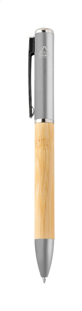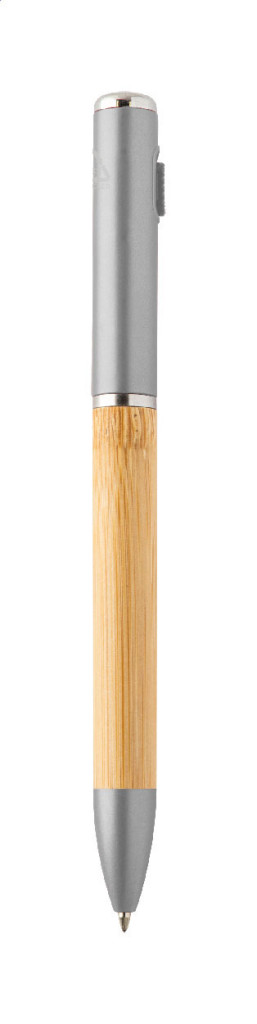 Bambuszból és újrahasznosított ABS műnyagból készült, tekerős golyóstoll 1 LED zseblámpával. Kék tollbetéttel és gombelemmel.