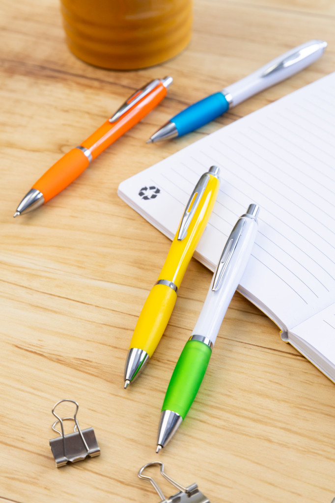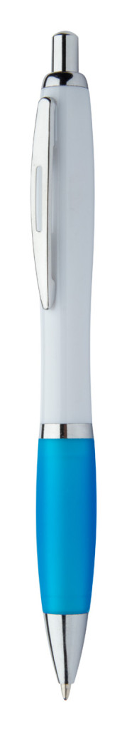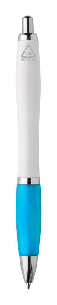 Újrahasznosított ABS műanyag golyóstoll fehér testtel, színes markolattal és króm részekkel. Kék tollbetéttel.