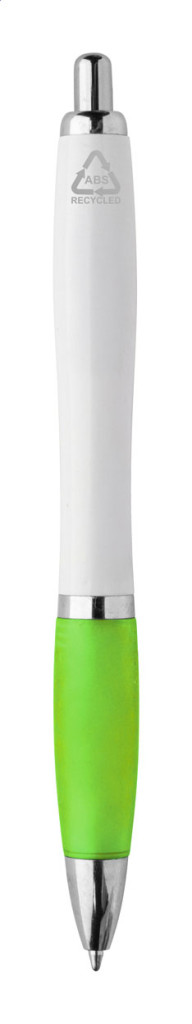 Újrahasznosított ABS műanyag golyóstoll fehér testtel, színes markolattal és króm részekkel. Kék tollbetéttel.