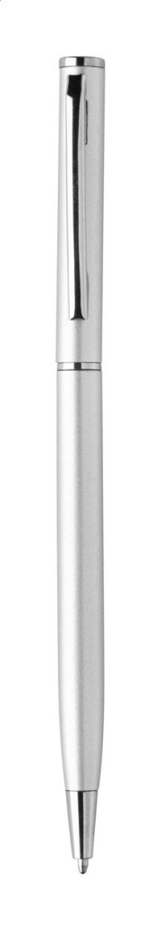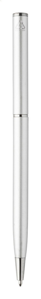 Újrahasznosított alumínium tekerős golyóstoll króm részekkel. Kék tollbetéttel.