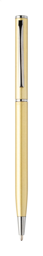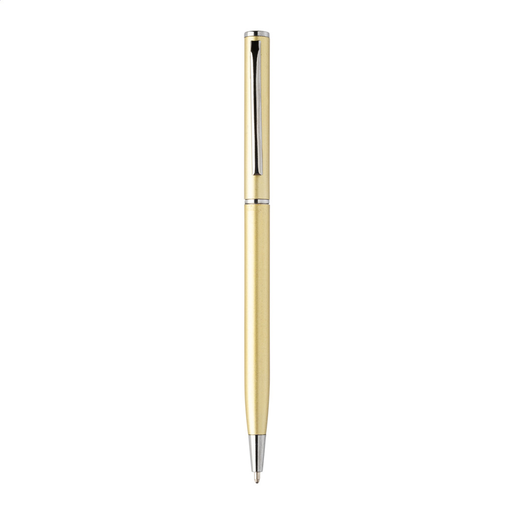 Újrahasznosított alumínium tekerős golyóstoll króm részekkel. Kék tollbetéttel.