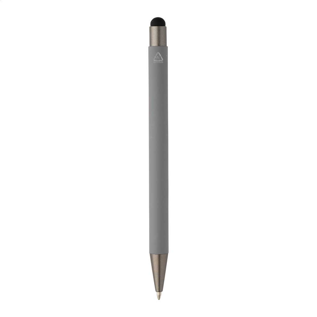 Újrahasznosított alumínium és érintőképernyős golyóstoll gumírozott testtel és fegyverfém részekkel. Kék tollbetéttel.