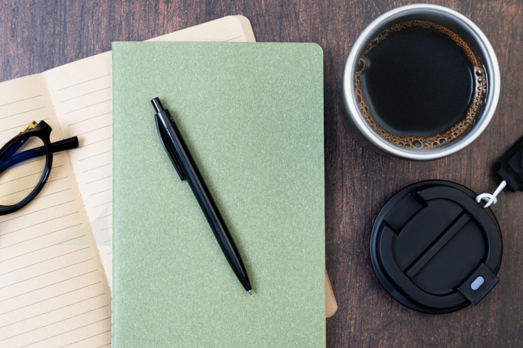 Újrahasznosított papírral borított jegyzetfüzet varrott borítóval és 60 vonalas lappal, újrahasznosított kraft papírból. A5 méretű.