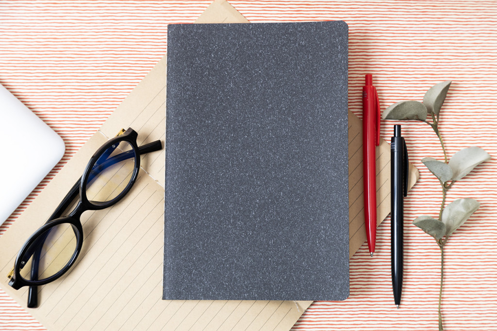 Újrahasznosított papírral borított jegyzetfüzet varrott borítóval és 60 vonalas lappal, újrahasznosított kraft papírból. A5 méretű.