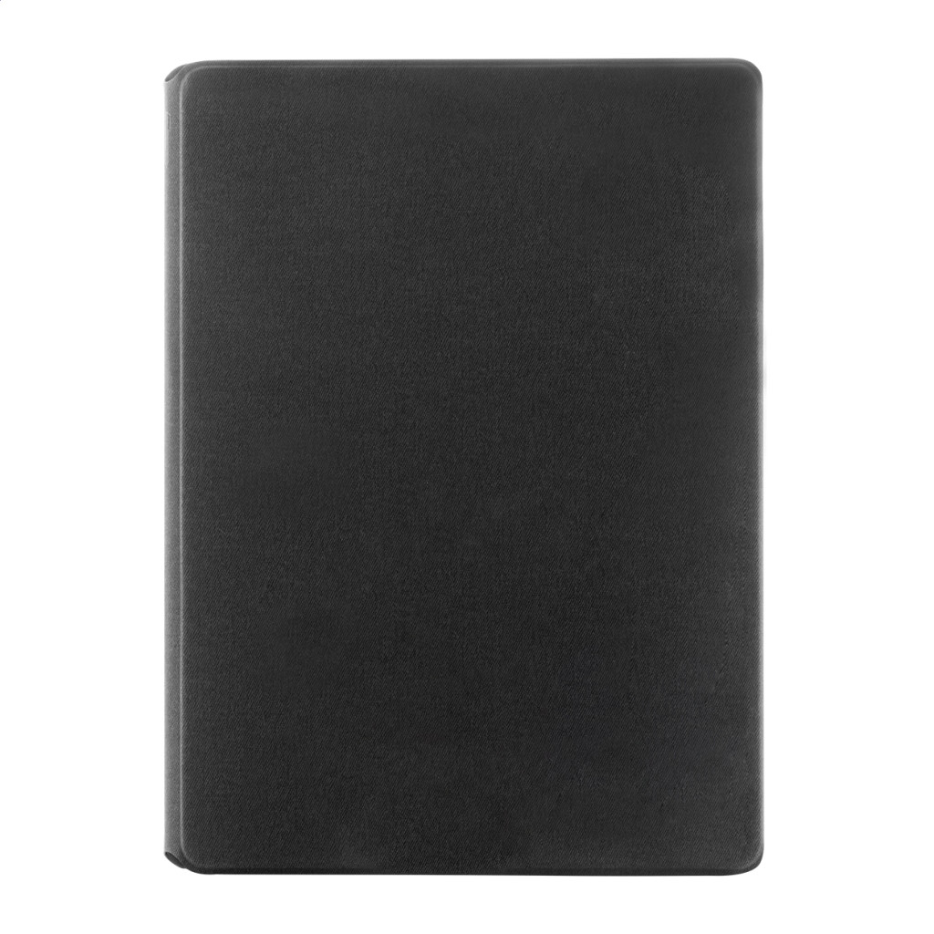 A4-es méretű, újrahasznosított PU bőr iratmappa belső rendezőzsebekkel és mágneses zárással. 20 vonalas lapos jegyzettömbbel újrahasznosított papírból.