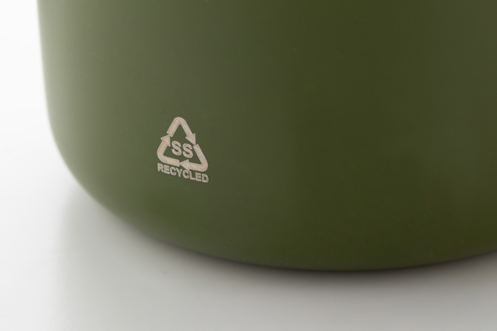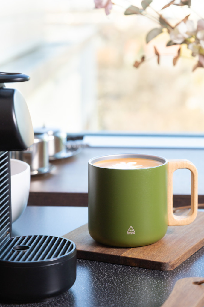 Duplafalú, újrahasznosított rozsdamentes acélból készült thermo bögre fa fogantyúval. 350 ml