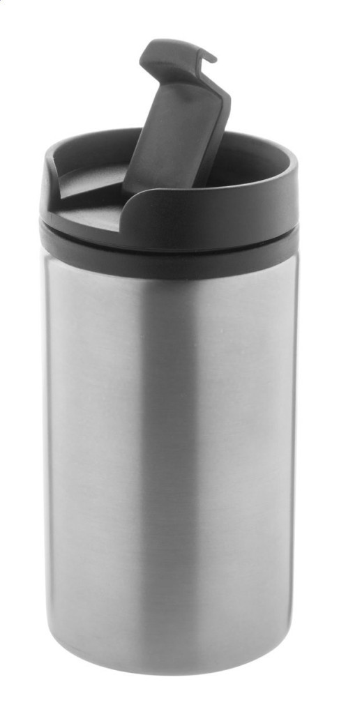 Duplafalú, újrahasznosított rozsdamentes acélból készült hőszigetelt thermo pohár, PP műanyag belsővel és ivófedéllel. 250 ml.