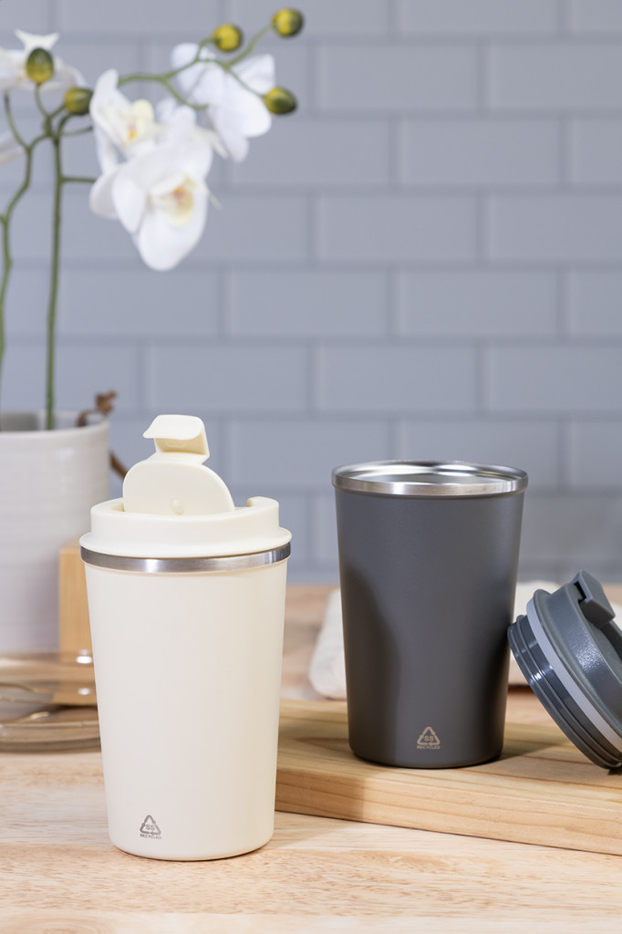 Duplafalú, újrahasznosított rozsdamentes acélból készült hőszigetelt thermo pohár, PP ivófedéllel. 350 ml.