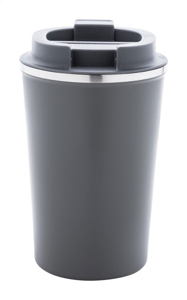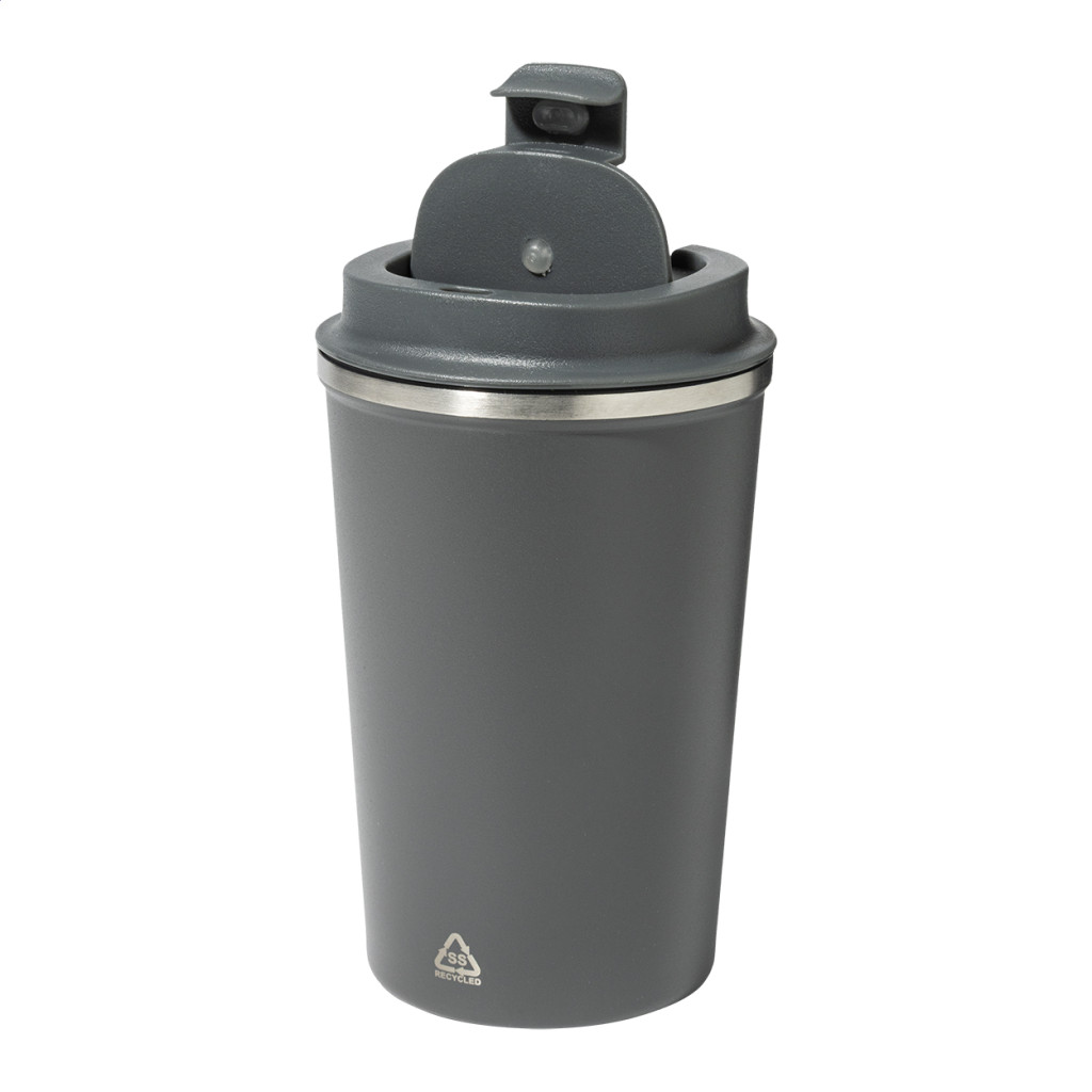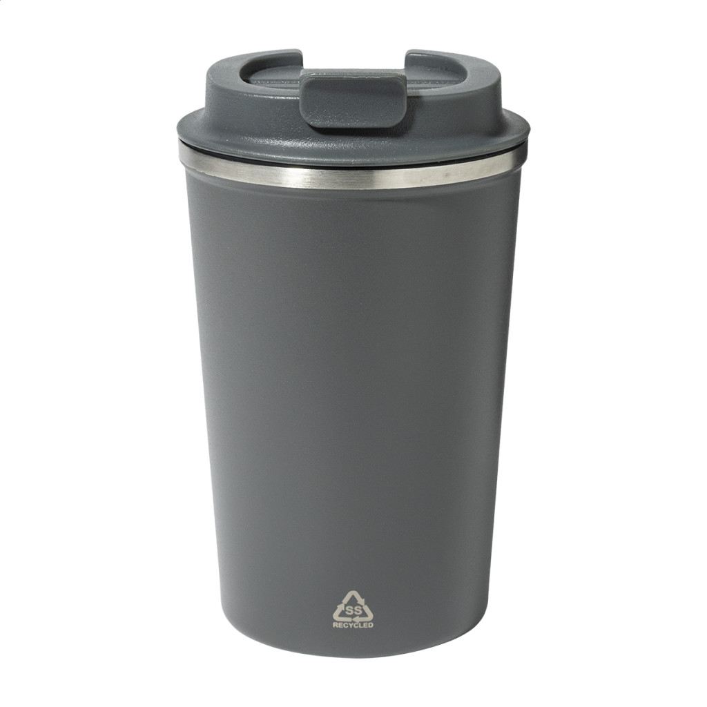 Duplafalú, újrahasznosított rozsdamentes acélból készült hőszigetelt thermo pohár, PP ivófedéllel. 350 ml.