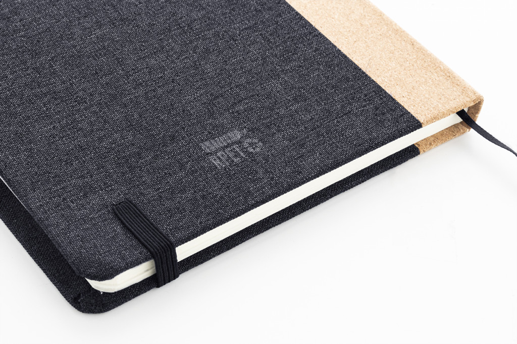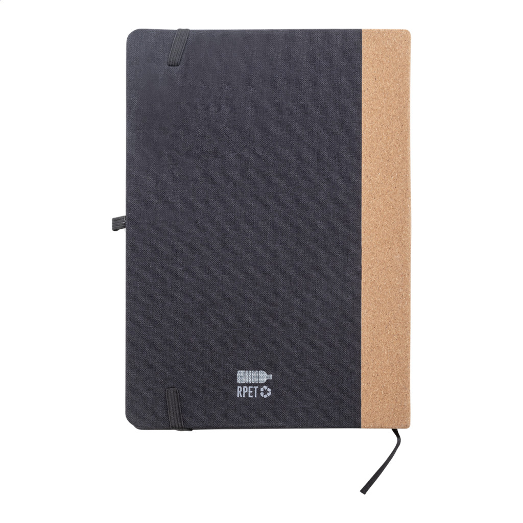 RPET poliészter borítású jegyzetfüzet natúr parafa gerinccel és 80 vonalas lappal, újrahasznosított papírból. Könyvjelzővel, gumipánttal és tolltartóval. A5 méretű.