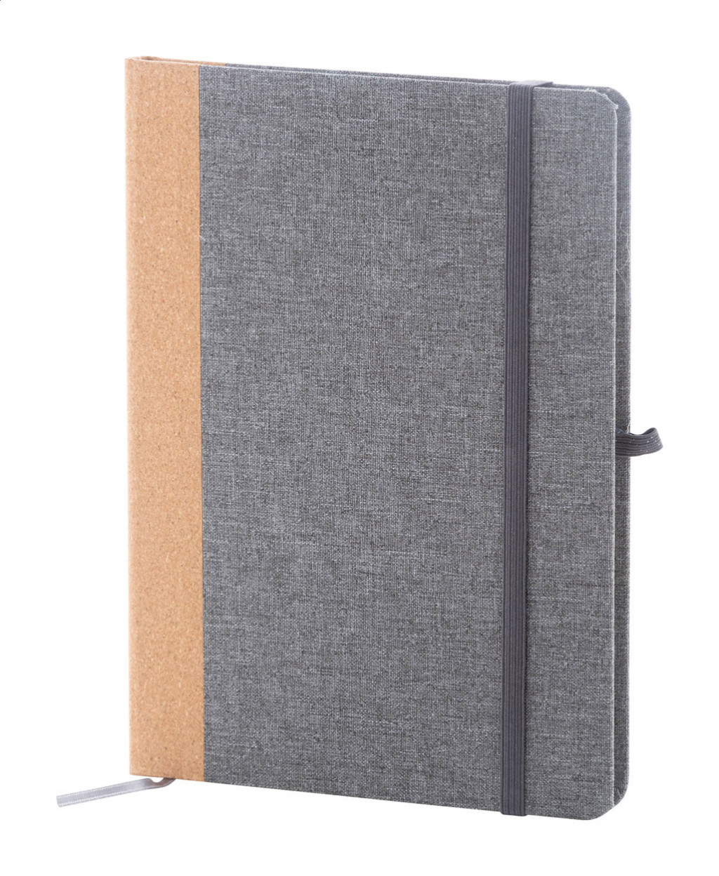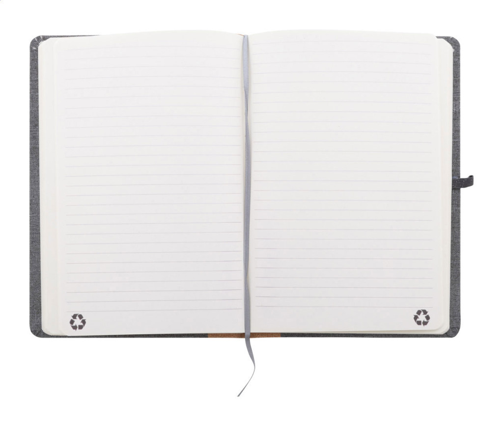 RPET poliészter borítású jegyzetfüzet natúr parafa gerinccel és 80 vonalas lappal, újrahasznosított papírból. Könyvjelzővel, gumipánttal és tolltartóval. A5 méretű.