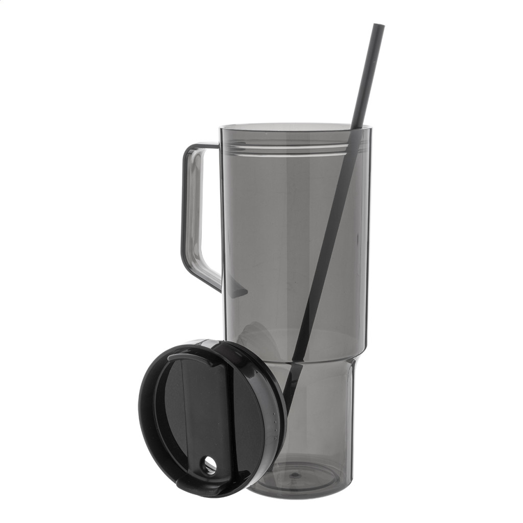Egyfalú RPET utazóbögre, hozzáillő színű PP ivófedéllel és szívószállal. 1200 ml.