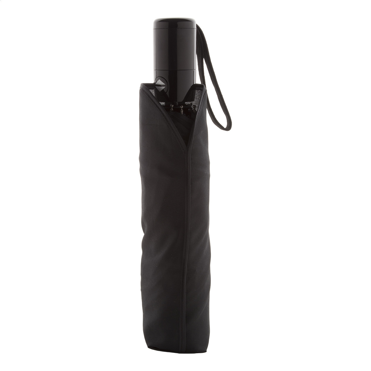 8 paneles szélálló, mindkét irányban automata esernyő fém vázzal, valamint fém és üvegszálas merevítőkkel. Színével egyező csuklópánttal és tokkal. Anyaga: 190T pongee.