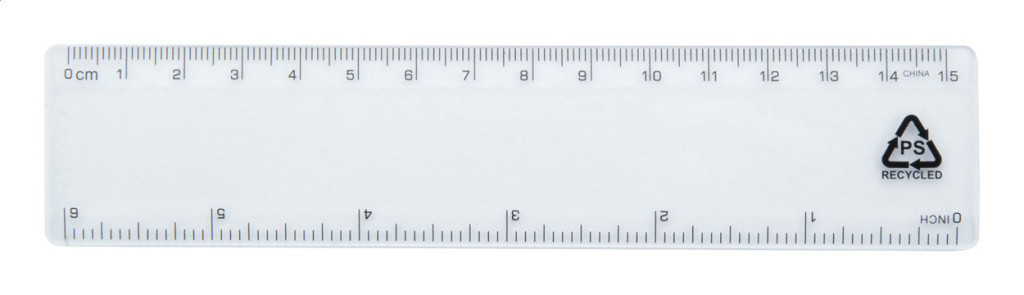 Újrahasznosított PS műanyag vonalzó, 15 cm.