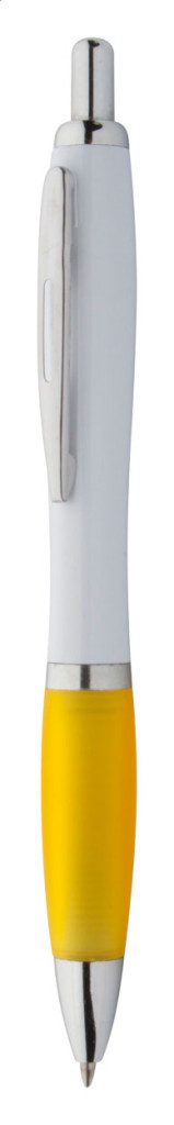 Műanyag golyóstoll fehér testtel, színes markolattal, fényes króm részekkel. Kék tollbetéttel szállítjuk.