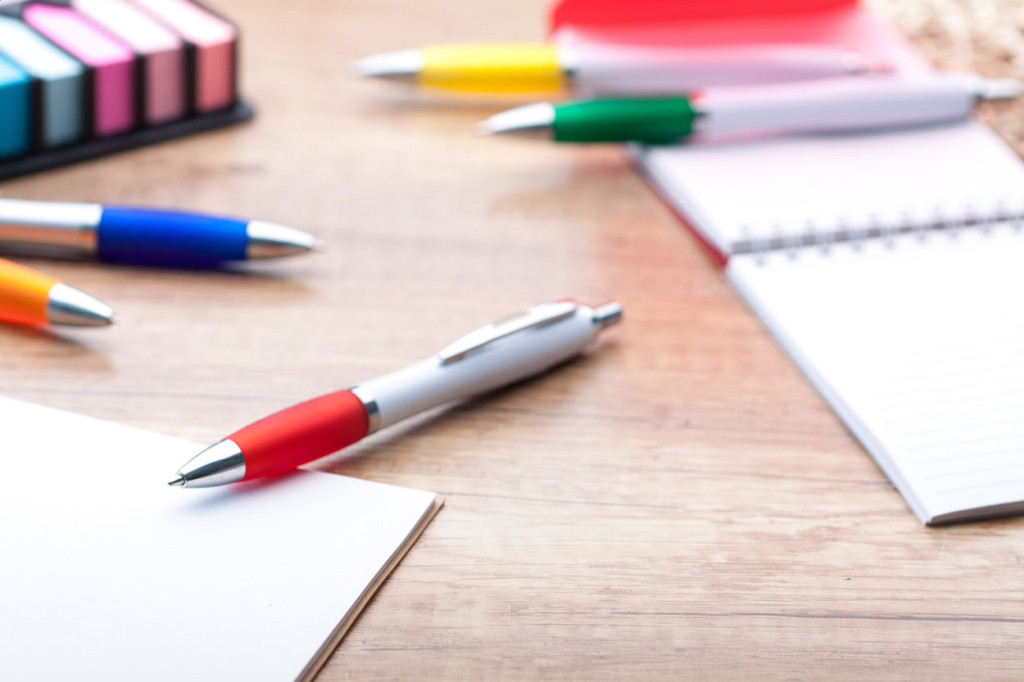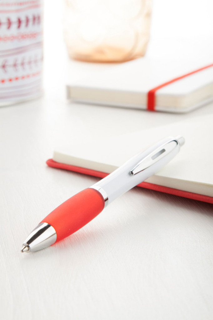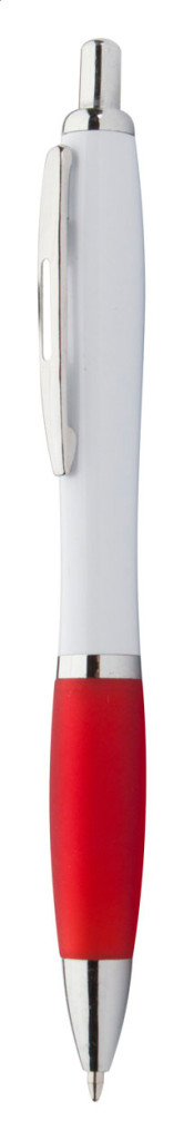 Műanyag golyóstoll fehér testtel, színes markolattal, fényes króm részekkel. Kék tollbetéttel szállítjuk.