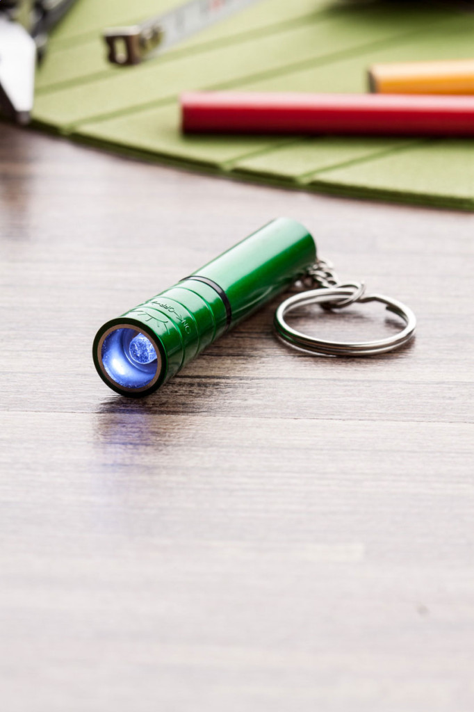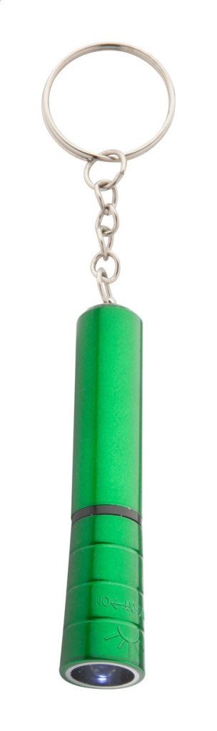 Műanyag, mini zseblámpa LED fénnyel, fémes felülettel és fém kulcstartóval. Gombelemmel szállítjuk.